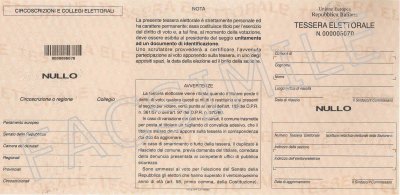 La tessera elettorale è un documento che contiene i dati anagrafici dell'elettore, il numero della sezione elettorale, l'indirizzo del luogo di votazione e i numeri dei collegi elettorali ai quali appartiene l'elettore. Inoltre, contiene 18 spazi per la certificazione dell'espressione del voto.